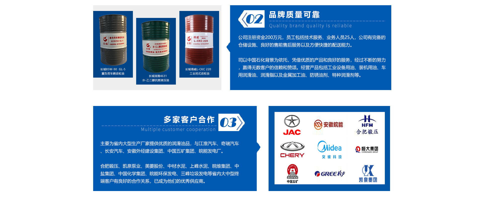安徽金啟石化有限公司成立于2009年,坐落于合肥市包河工業園人民大街18號。我公司是中國石化授權安徽地區長城牌潤滑油總代理商。同時還經營代理昆侖、美孚、殼牌、德一等國內外品牌潤滑油。公司注冊資金200萬元,員工包括技術服務、業務人員25人,公司有完備的倉儲設施、良好的售前售后服務以及方便快捷的配送能力。年經營各類品牌潤滑油6000噸,目前實現年銷售額1億元。 公司以中國石化背景為依托,憑借好的產品和良好的服務,經過不斷的努力,贏得無數客戶的信賴和贊頌。經營產品包括工業設備用油、裝機用油、車用潤滑油、潤滑脂以及金屬加工油、防銹油劑、特種潤滑劑及表面處理劑、清洗劑等,服務于汽車、電力、工程...